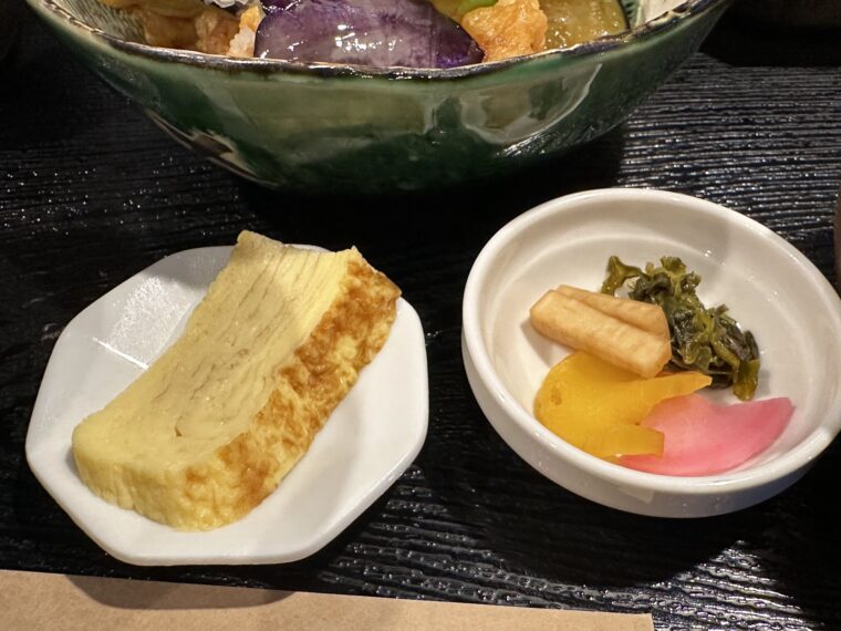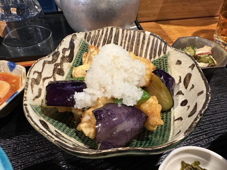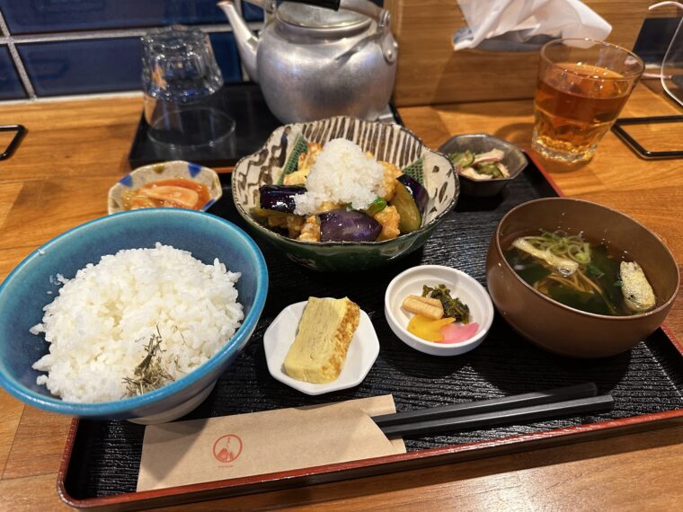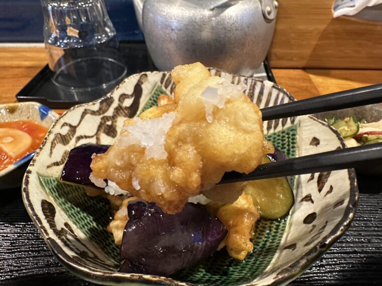 唐揚げはジューシーながら軽めの衣で、茄子もじゅわっと味を吸っていて絶妙。