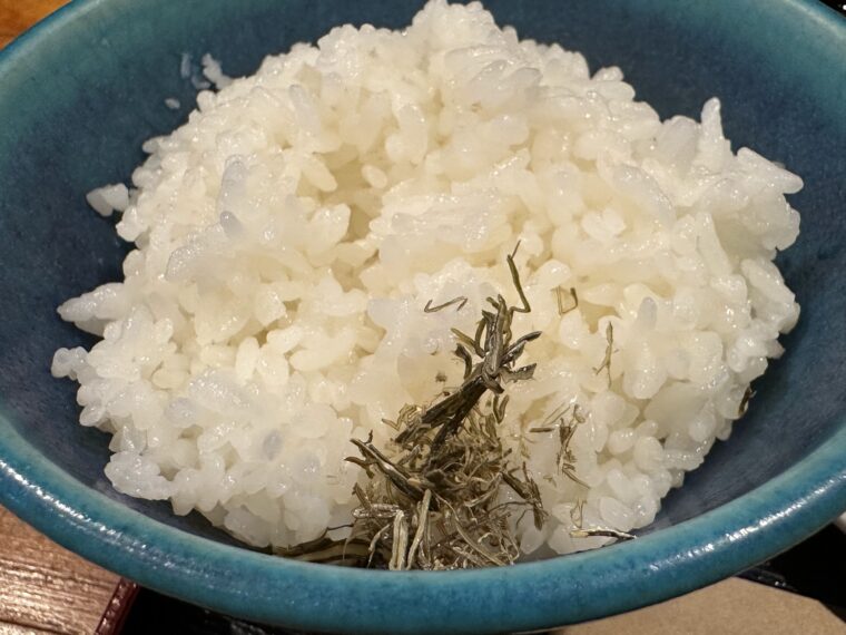 ご飯もツヤっと炊き上がっていて、上に乗っているのはほんのり塩気のきいた針昆布(?)