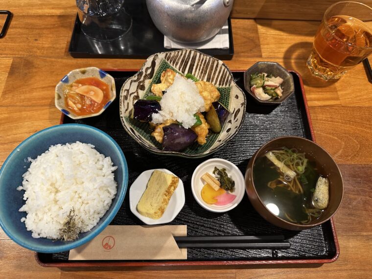 唐揚げはジューシーながら軽めの衣で、茄子もじゅわっと味を吸っていて絶妙。