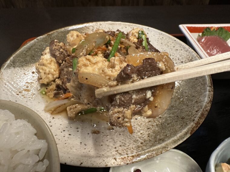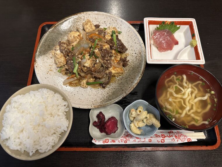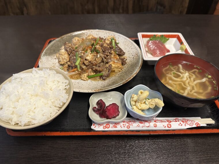 ニンニク香る「牛肉と豆腐のニンニク炒め定食」を沖縄食堂 東雲で