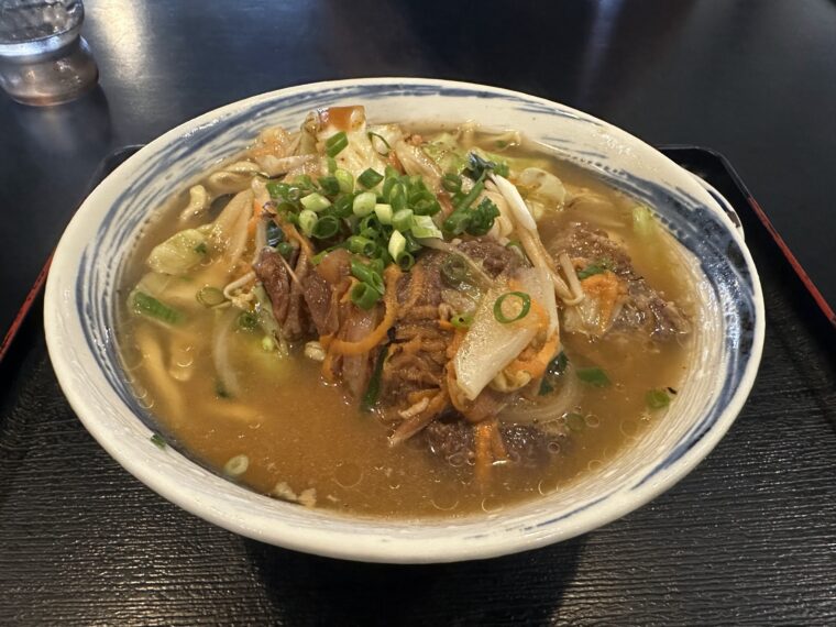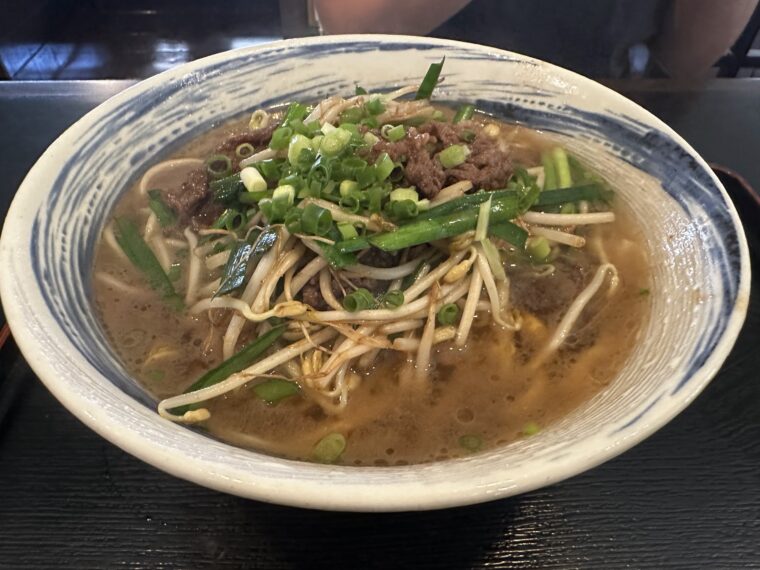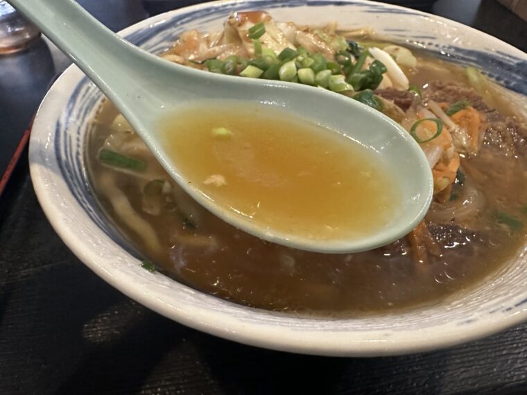 甘辛く炒めた牛肉がスープに染み出し、香ばしいコクが加わってクセになる味わい。