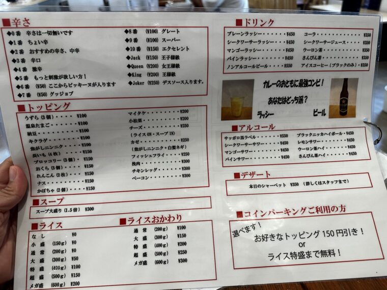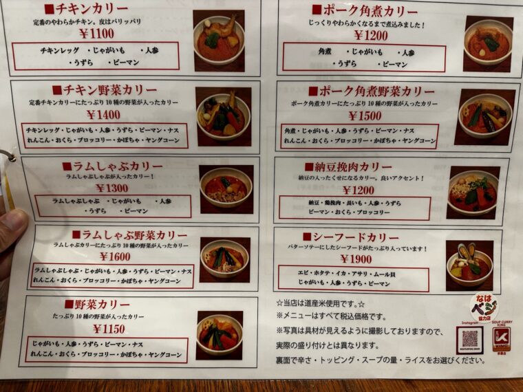 メニューを見ると、定番のチキンカリー1,100円、ラムしゃぶ野菜カリー1,600円、ポーク角煮カリー1,200円など、札幌スープカレーらしい多彩さ。しかも「学生さん、学割100円引き」のポップもあって、これなら学生も通いやすい。チキン野菜カリーとラムしゃぶ野菜カリーは食べたことあるけど、どちらもおすすめやね。