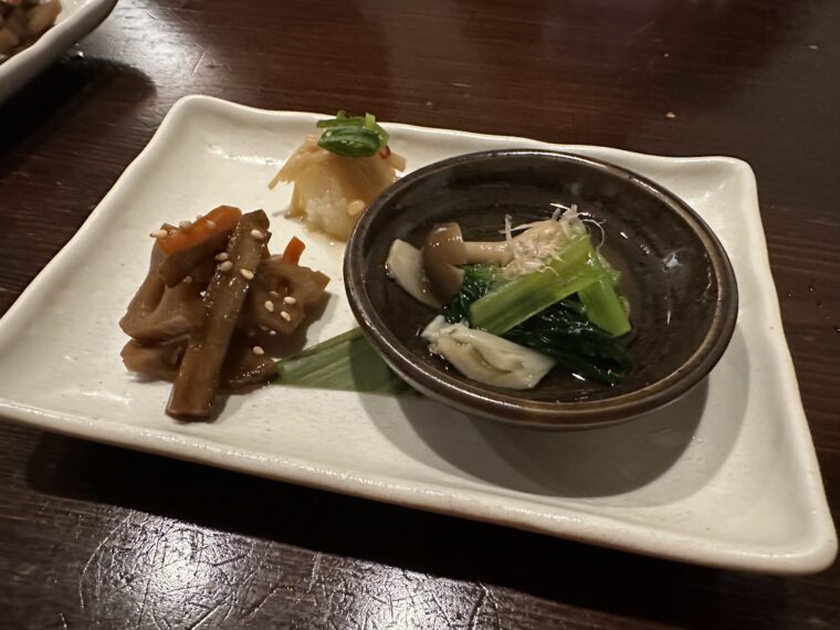お通しはおばんざい3種盛り。しみじみ美味しい。これだけで酒がすすむ。
