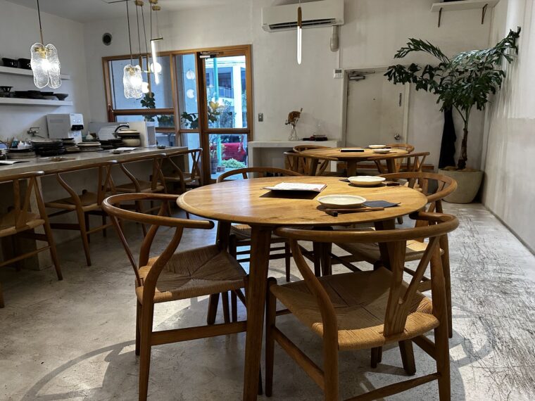店内に足を踏み入れると、木の温もりが感じられるテーブルと椅子が並び、北欧家具を思わせるシンプルで洗練された空間が広がります。白を基調とした内装に、センスの良い照明や観葉植物が映え、心地よい落ち着きを演出。