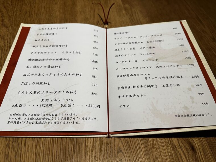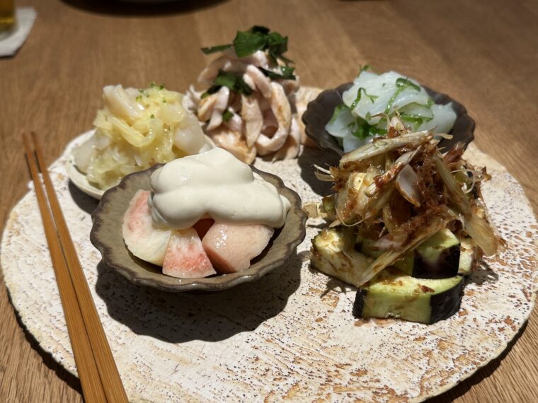 まず頼んでほしいのは、前菜の3点盛りか5点盛り。季節野菜と旬の素材を彩り豊かに仕上げた一皿。水茄子と島らっきょうの和え物や、新鮮な魚を使った一品、果物を活かした爽やかな前菜など、和と洋を自在に組み合わせた料理が並びます。