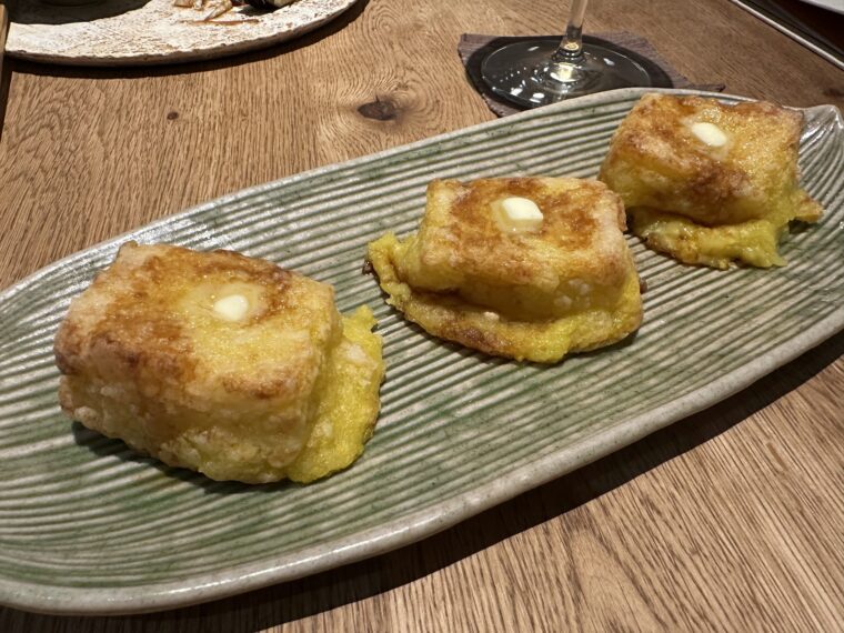 焼きもろこし豆腐も名物のひとつ。軽めのワインをあわせて楽しめますよ。